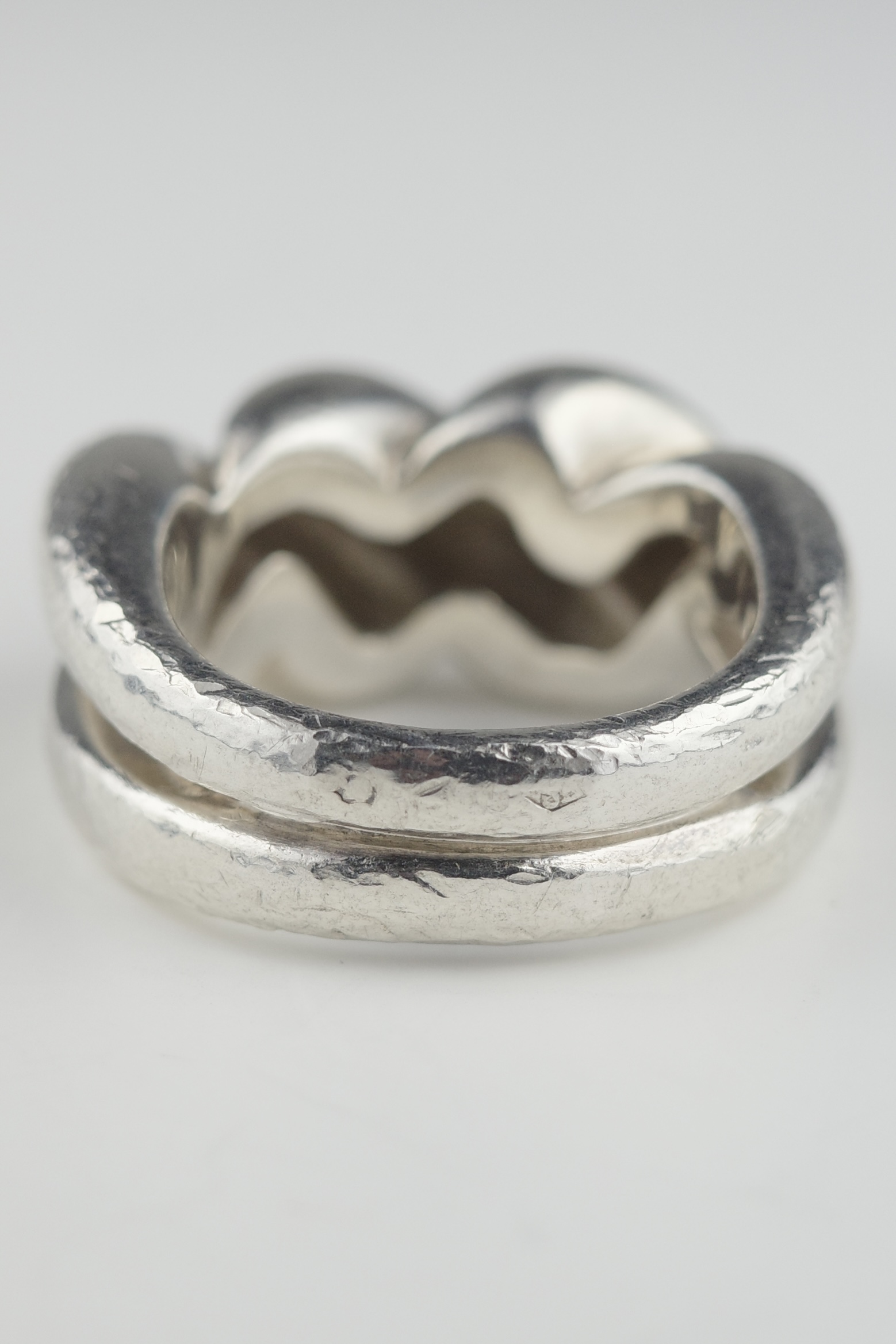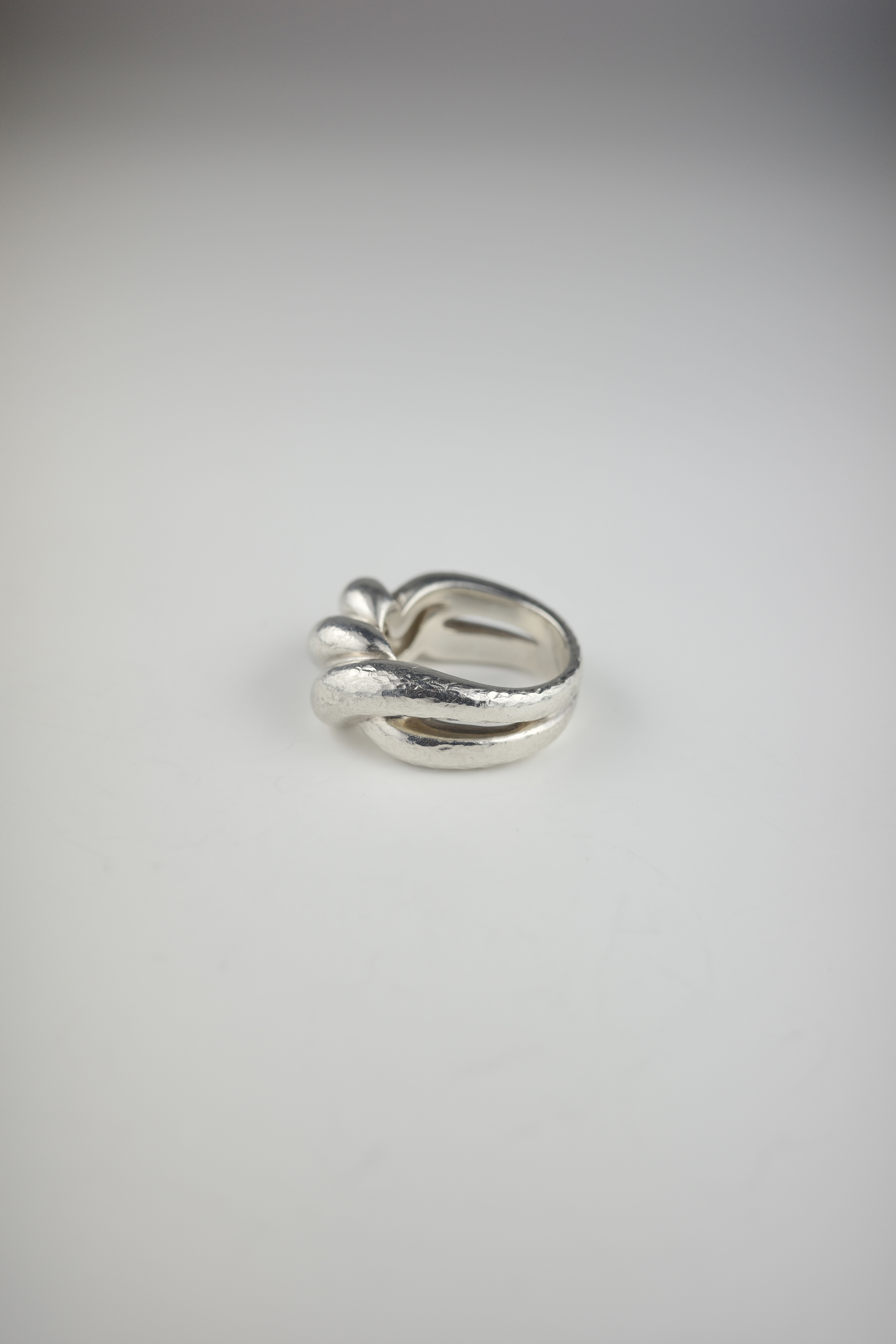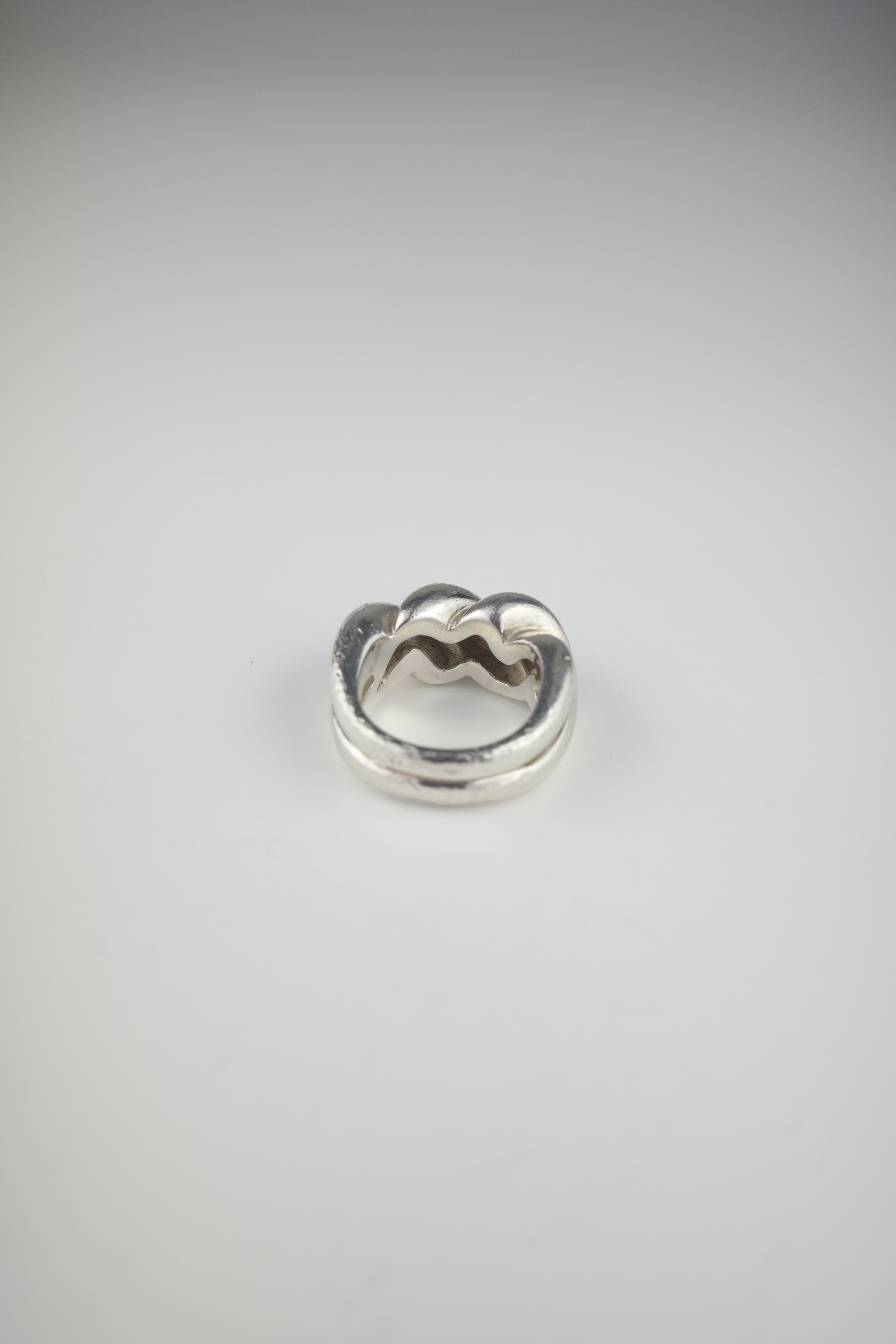 エルメスのヴィンテージのトルサードリング。「Torsade(トルサード)」はフランス語で“ねじれ”を意味し、その名の通りロープを撚り合わせたような立体感のあるデザインが特徴。エルメスらしい上質なシルバーの質感と、職人技が感じられる滑らかな曲線美が際立つ一本です。本個体は一般的に流通しているトルサードリングに比べ、ひと回りほどボリュームのあるラージタイプ。このサイズ感の個体は流通数が少なく、市場でも希少性の高いアイテムです。シンプルでありながら造形の完成度が高く、ヴィンテージエルメスならではの風格と、時代を超えて愛される普遍的な美しさを兼ね備えた逸品。