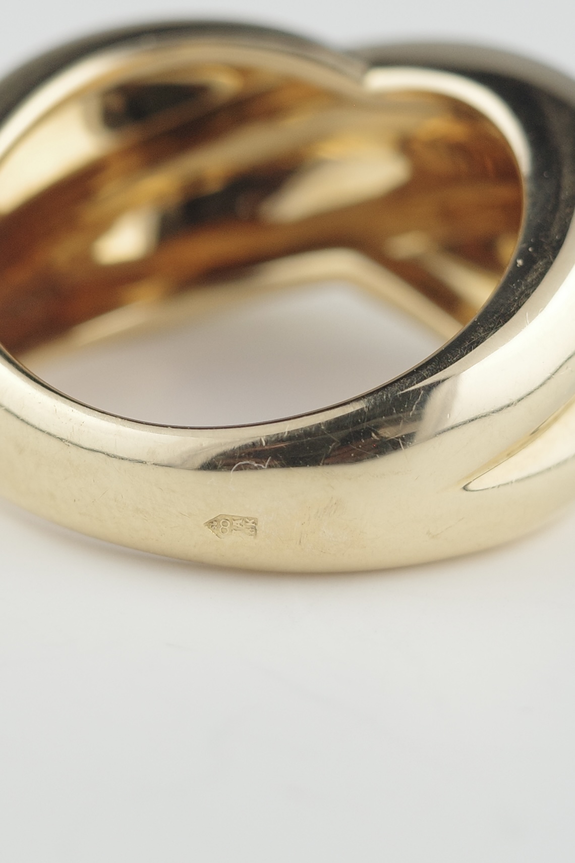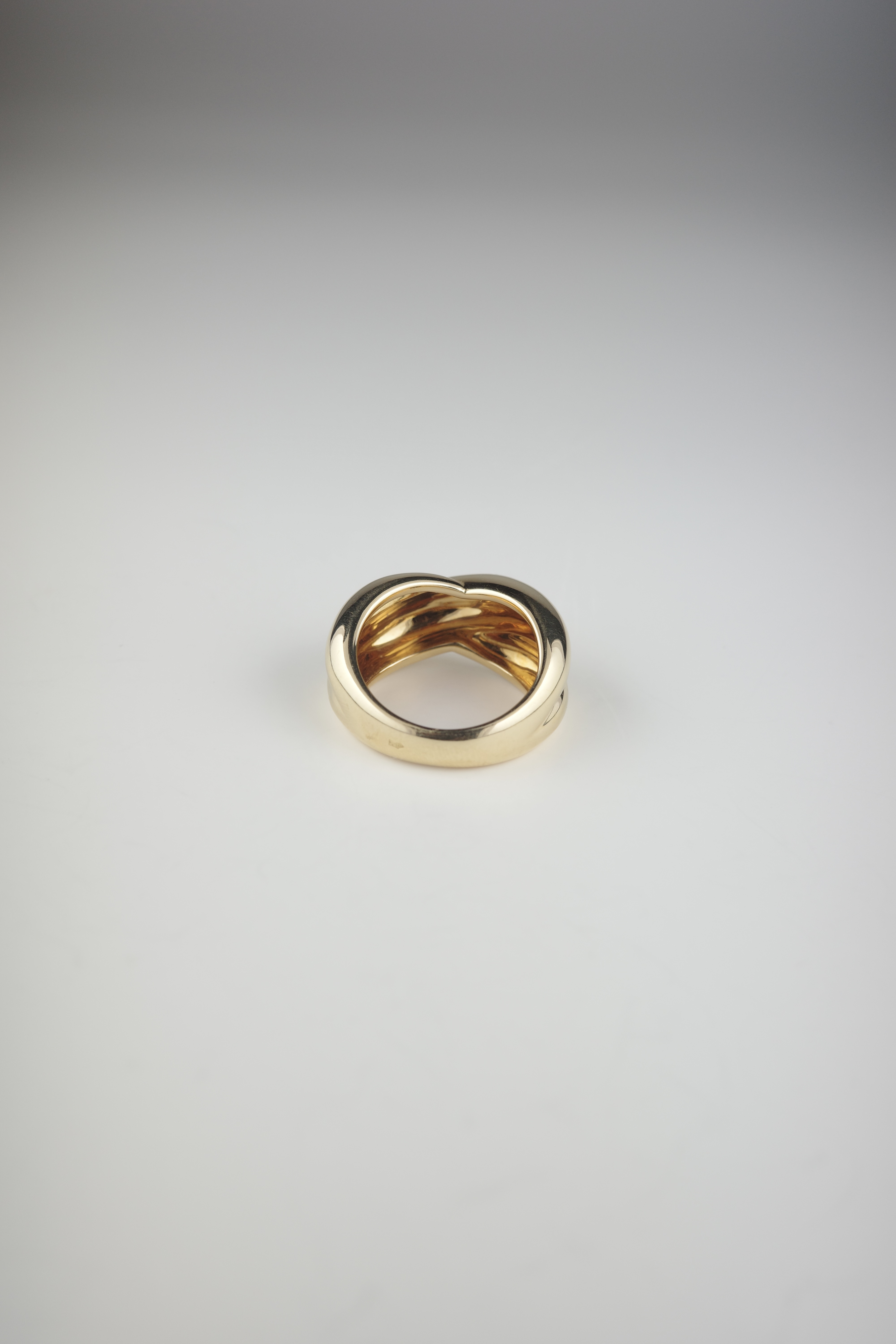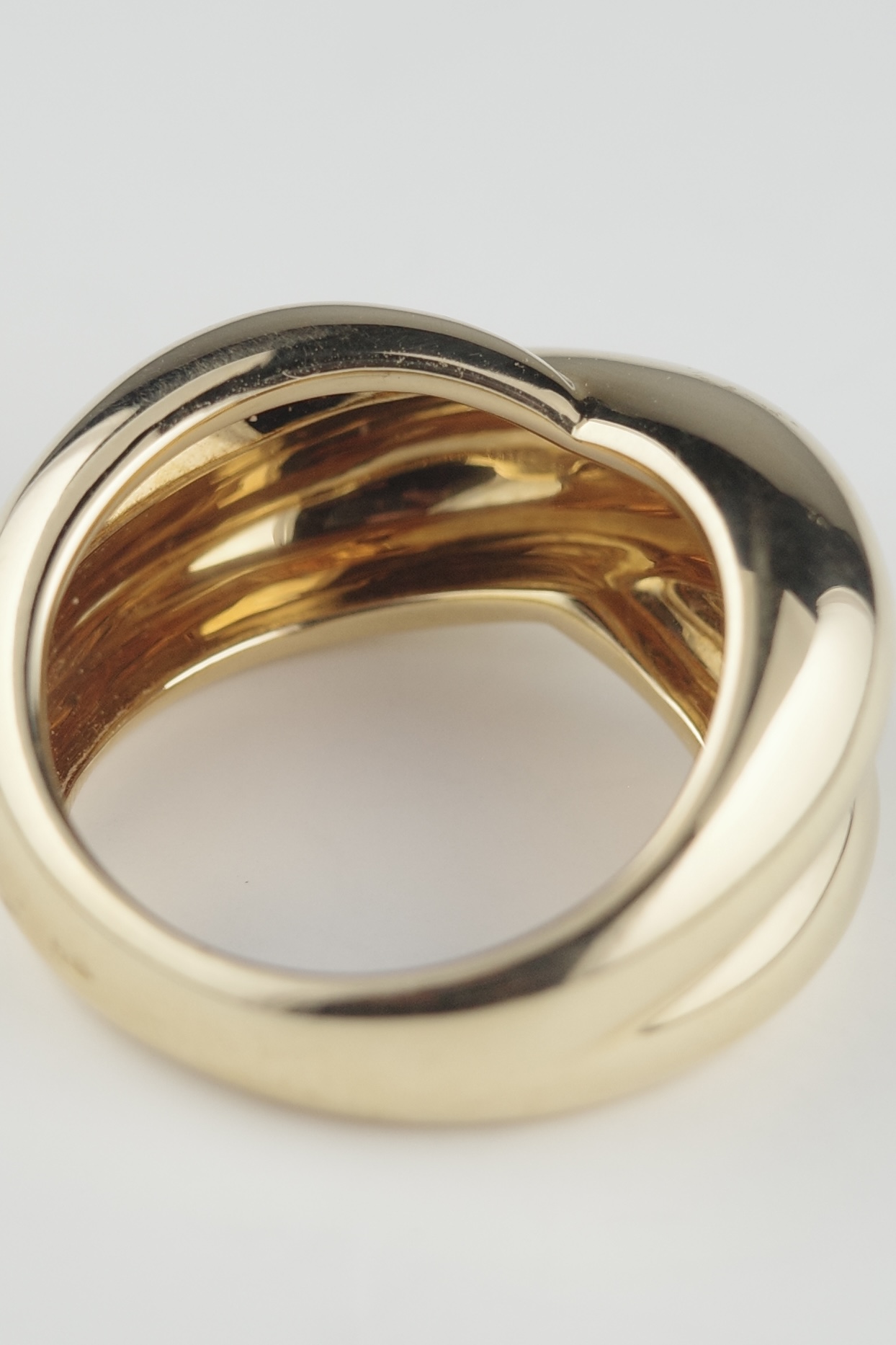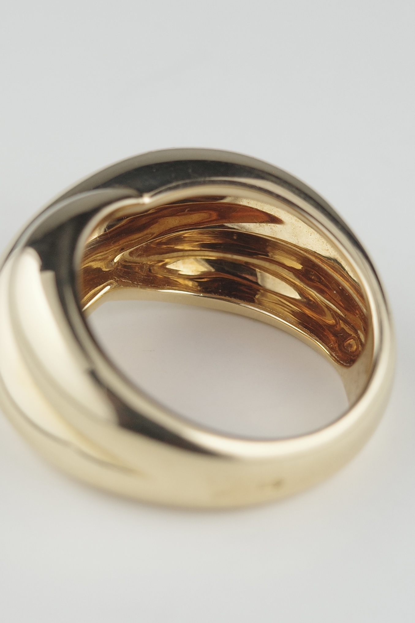 Cartierのヴィンテージコリゼリング。重なり合うような有機的なフォルムが特徴的で、滑らかな曲線美とボリューム感が指元に存在感をもたらします。シンプルでありながらも立体的な造形は、カルティエらしい洗練されたデザイン性が際立つアイテム。素材にはK18ゴールドを使用し、上品な艶と重量感を兼ね備えたラグジュアリーな仕上がり。現行では見られないヴィンテージ特有のデザインで、流通数も少なく希少性の高いアイテムです。単体での着用はもちろん、スタイリングの主役としても映える存在感のあるリング。時代を超えて愛される、カルティエの美意識が詰まった逸品。